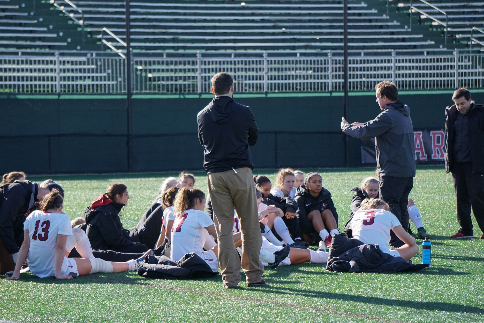 With the game tied 1-1 at the half, Harvard takes an opportunity to step back and take stock.