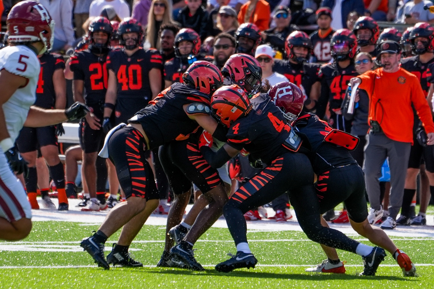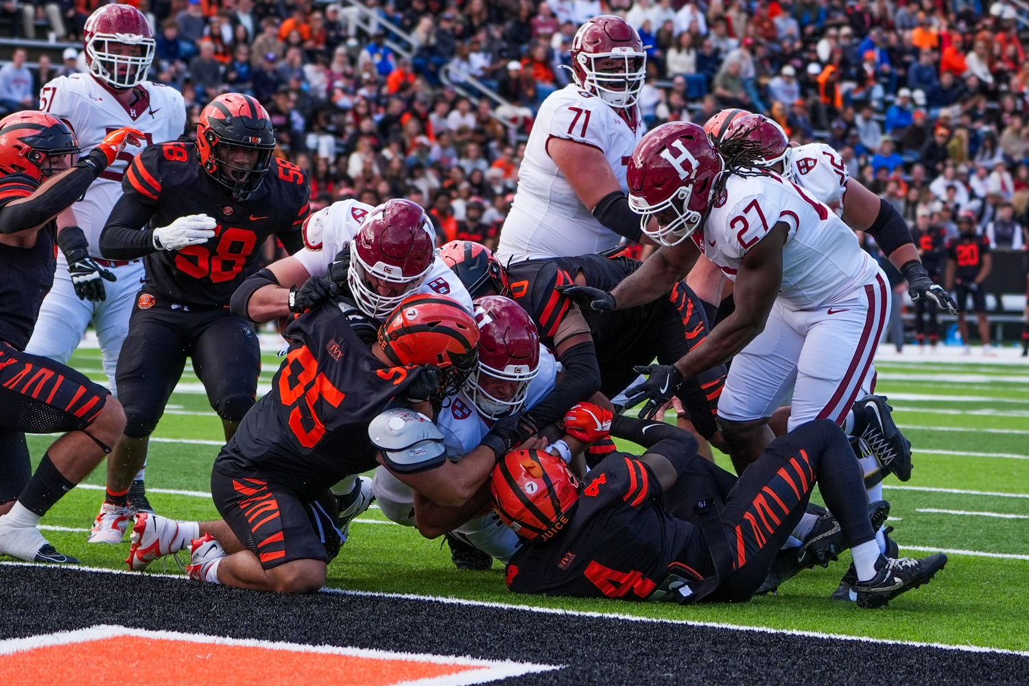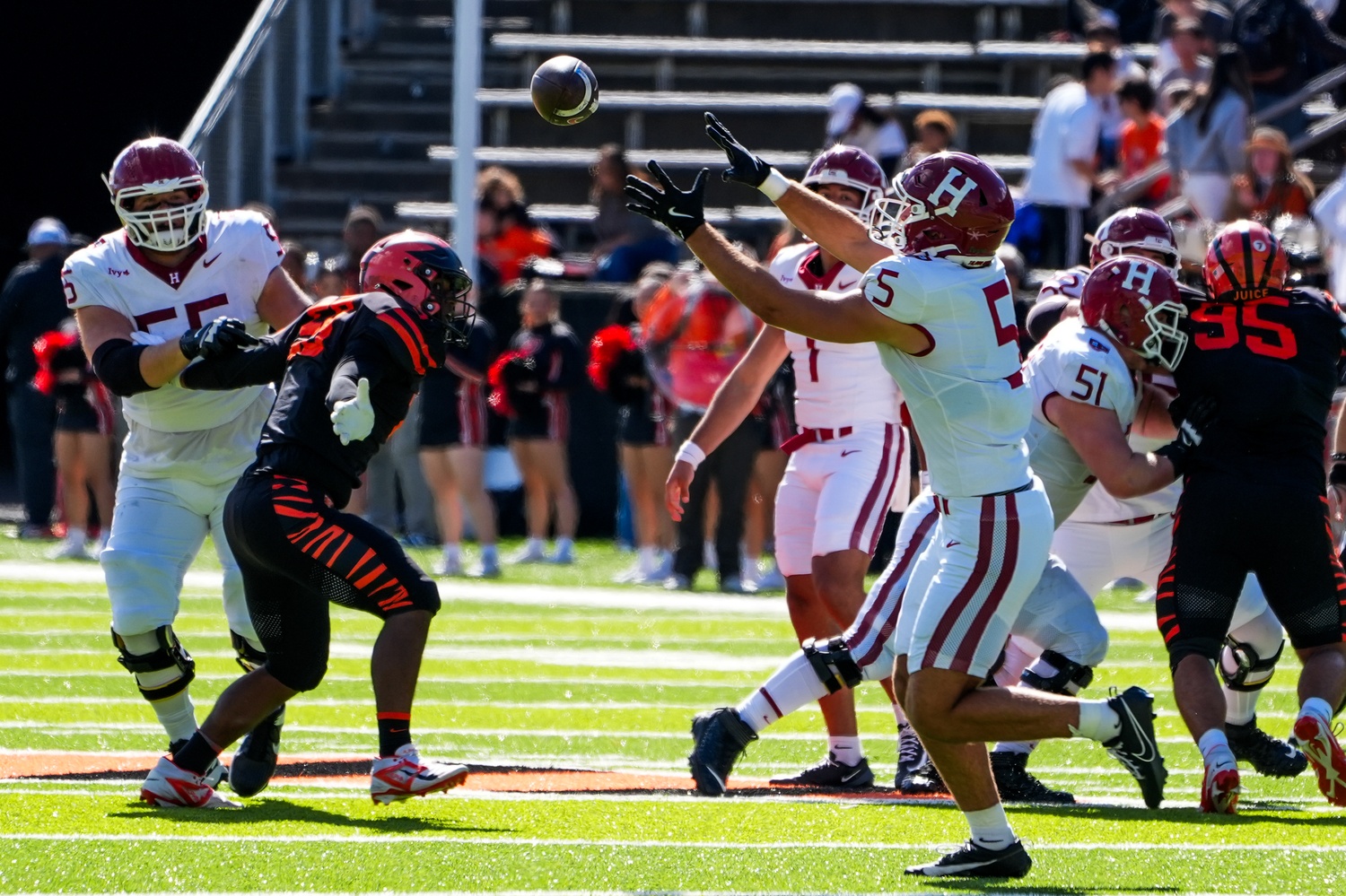 Line breaks up a pass from Princeton quarterback Kai Colon. The play was initially ruled a fumble, sparking controversy and frustration among Princeton fans during their homecoming matchup.