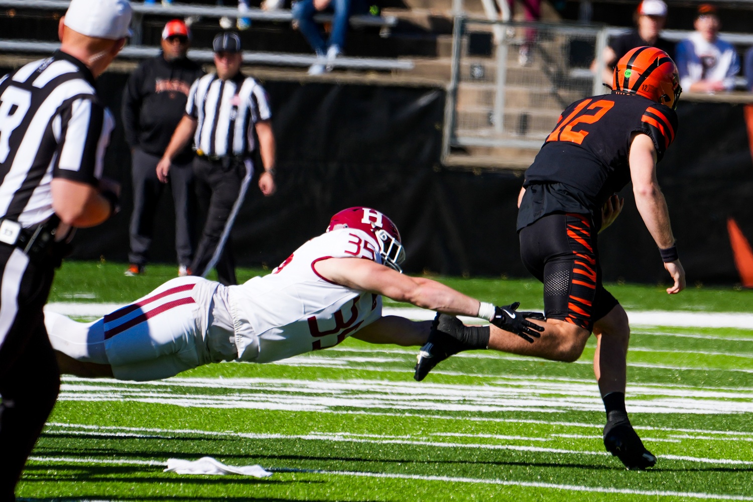 Junior linebacker Sean Line makes a shoestring tackle on Princeton quarterback Kai Colon. Line led the Crimson defense with a team-high 10 tackles, anchoring the unit with his physical play and field awareness.