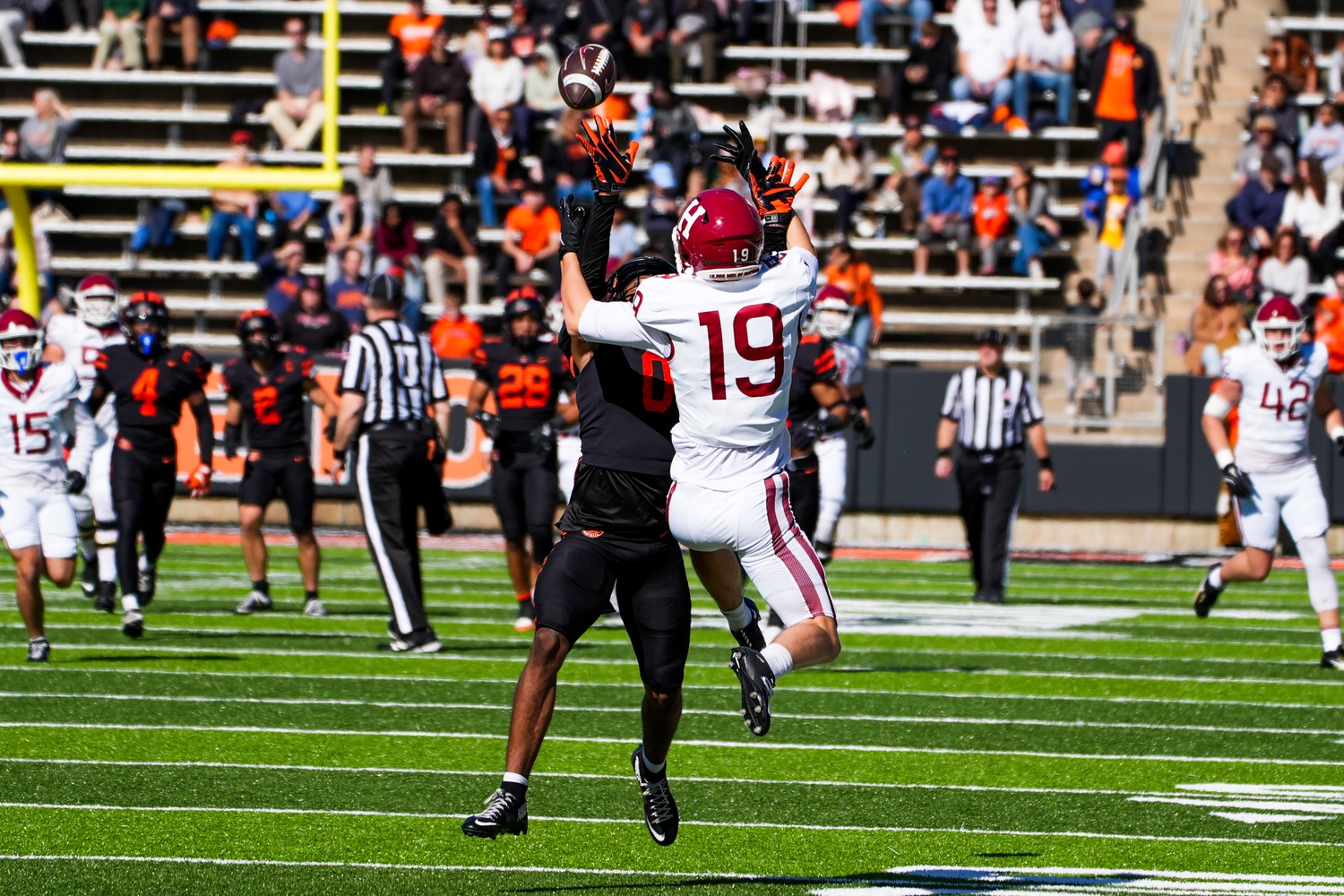 A Princeton defender is flagged for pass interference as sophomore wide receiver Brady Blackburn jumps to make a contested catch.