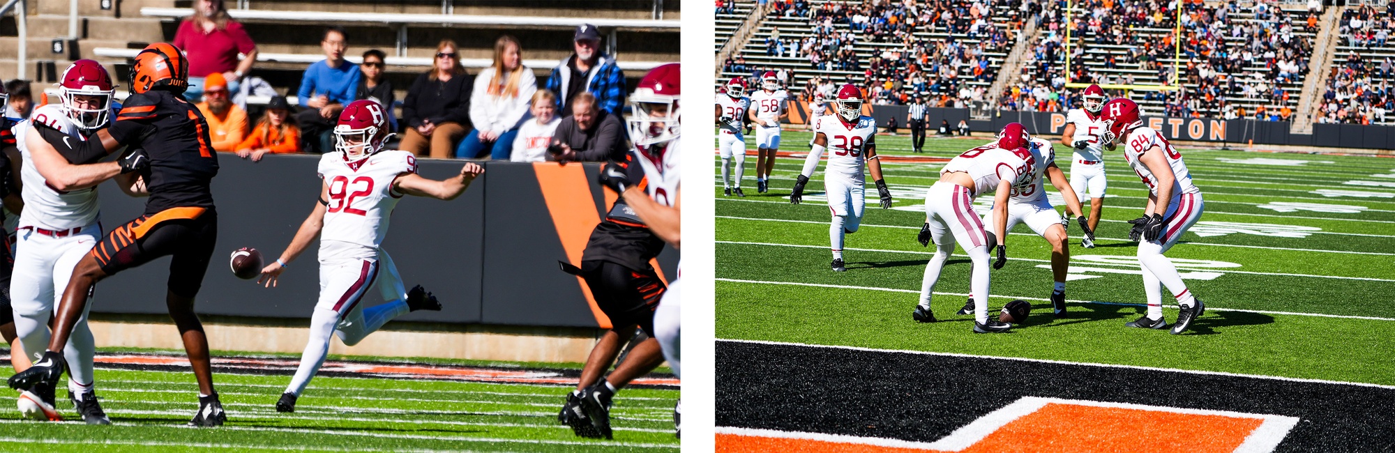 Sophomore kicker and punter Dylan Fingersh launches a 51-yard punt that pins Princeton at its own 3-yard line. Fingersh was consistent all game, recording three punts for a total of 142 yards to help control field position.