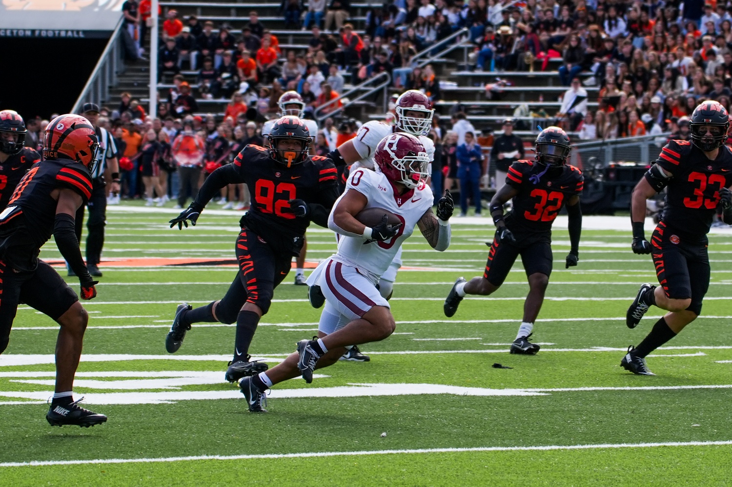 Henry is brought down as he races down the sideline, continuing to be a key deep threat in Harvard’s offensive attack.