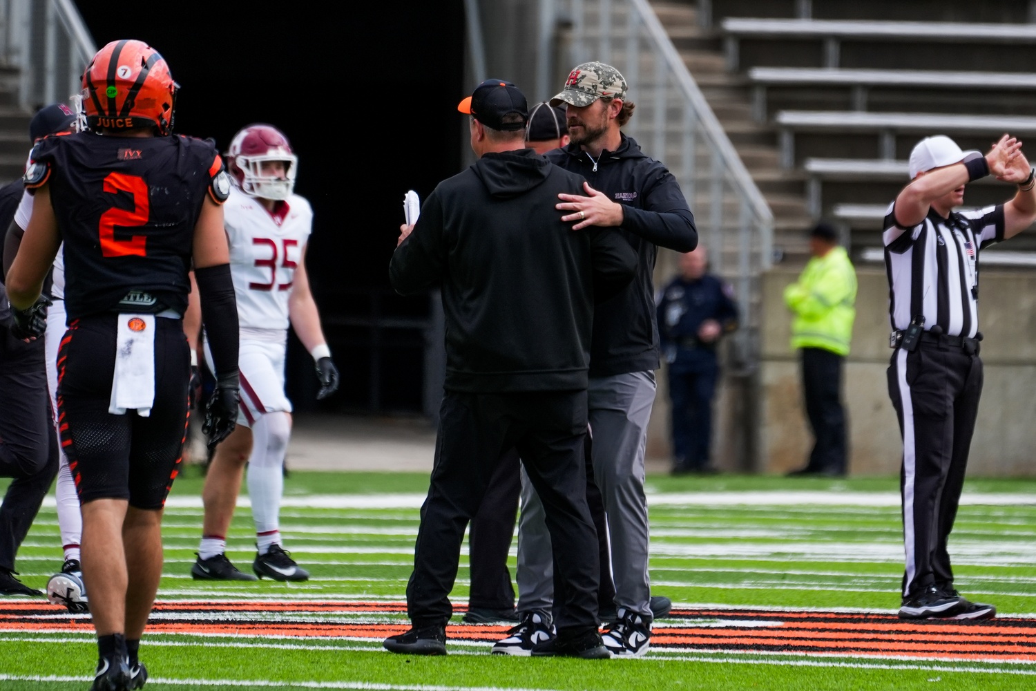 After the game, Harvard head coach Andrew Aurich shared an embrace with Princeton head coach Bob Surace. A Princeton alumnus, Aurich’s roots run deep, having played as an offensive lineman for the Tigers before spending eight seasons on their coaching staff.