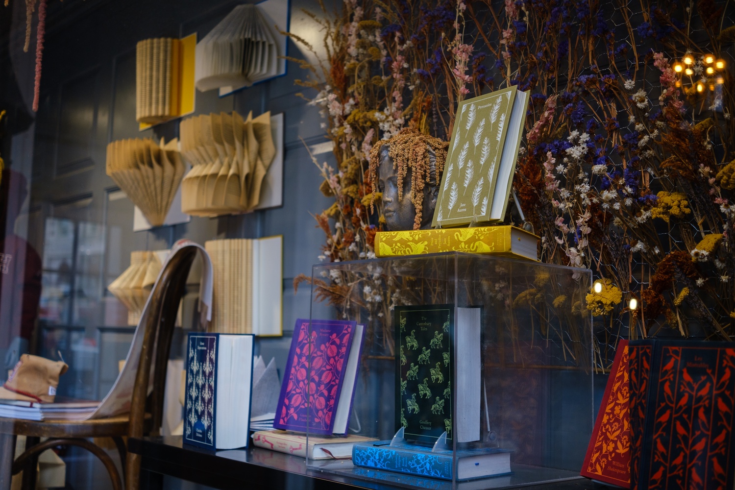 After pushing past frantic students and hordes of tourists in front of The Harvard Coop, we are greeted by a whimsical window display — dried flowers, book sculptures, and Greek-esque statue heads strategically accentuate the space.
