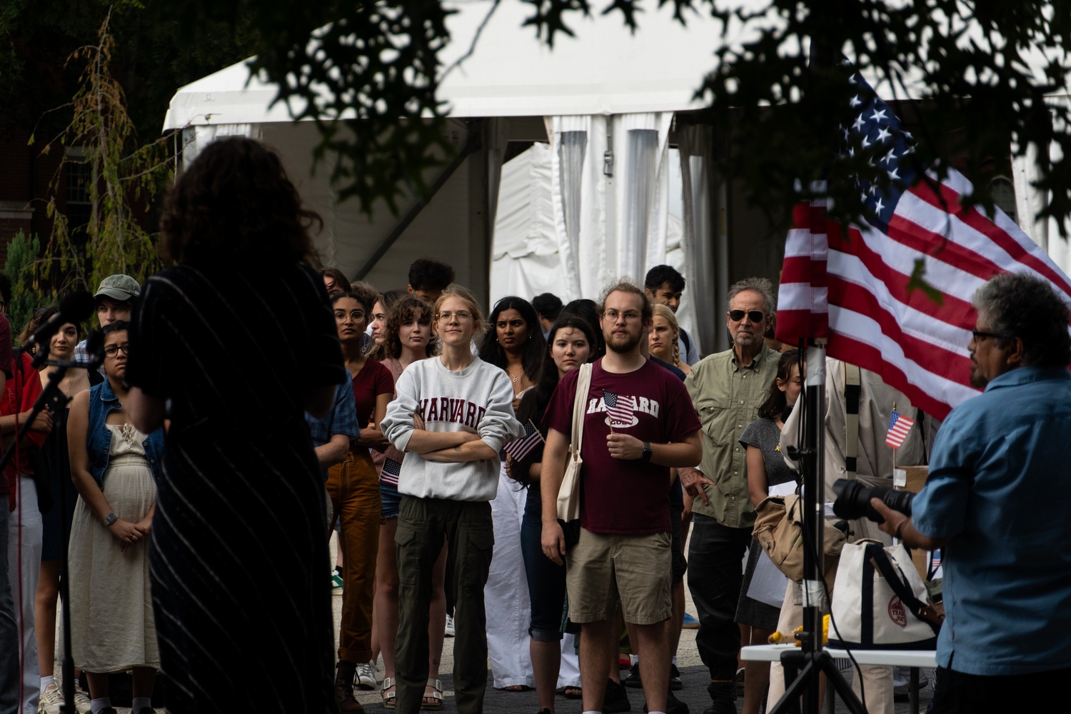 The hourlong demonstration — organized by Harvard Students for Freedom, an unrecognized student organization established in the spring — was the first since students returned to campus. It drew a substantially smaller crowd than the more than 300 who attended the group’s last rally in May, which took place shortly after the Department of Homeland Security revoked Harvard’s authorization to host international students.